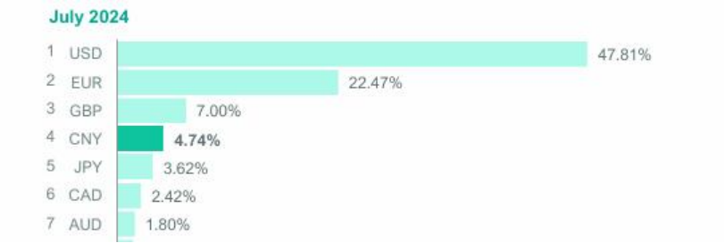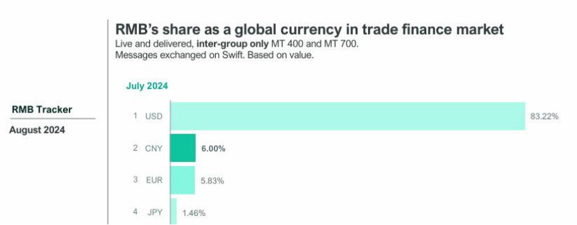 7月份,人民币作为全球货币在贸易融资市场的份额达到6%,超过欧元的5.83%,仅次于美元。