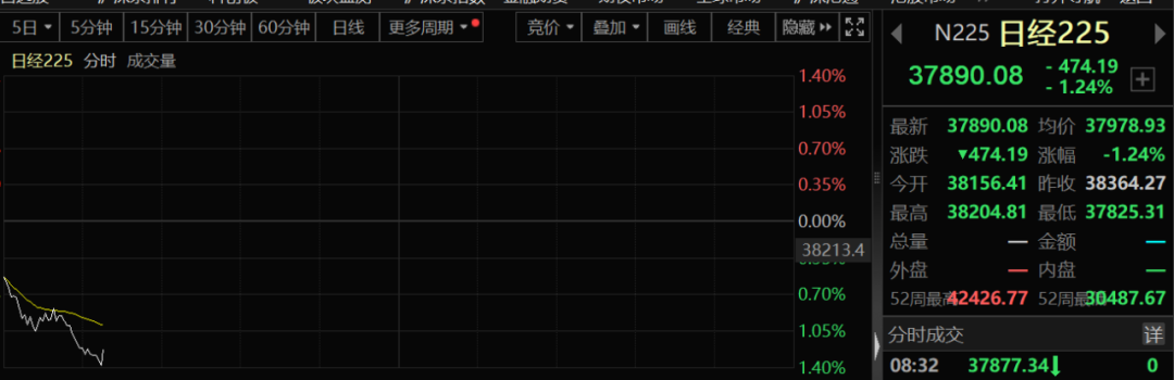 这种情况对应的应该是今天早盘亚太市场的集体飙升,然而事实并非如此。今天早盘,日本股市小幅低开,随后一路下调,日经225指数跌幅迅速扩大至1.2%以上。
