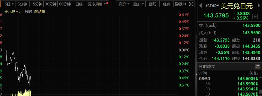 虽然上周五晚间美股收盘表现不俗,但今天早上的日本股市并未因此受到提振。日经225指数在小幅低开后直接杀跌,最新跌幅已经扩大至1.2%以上。与此同时,日元已经升至143附近。