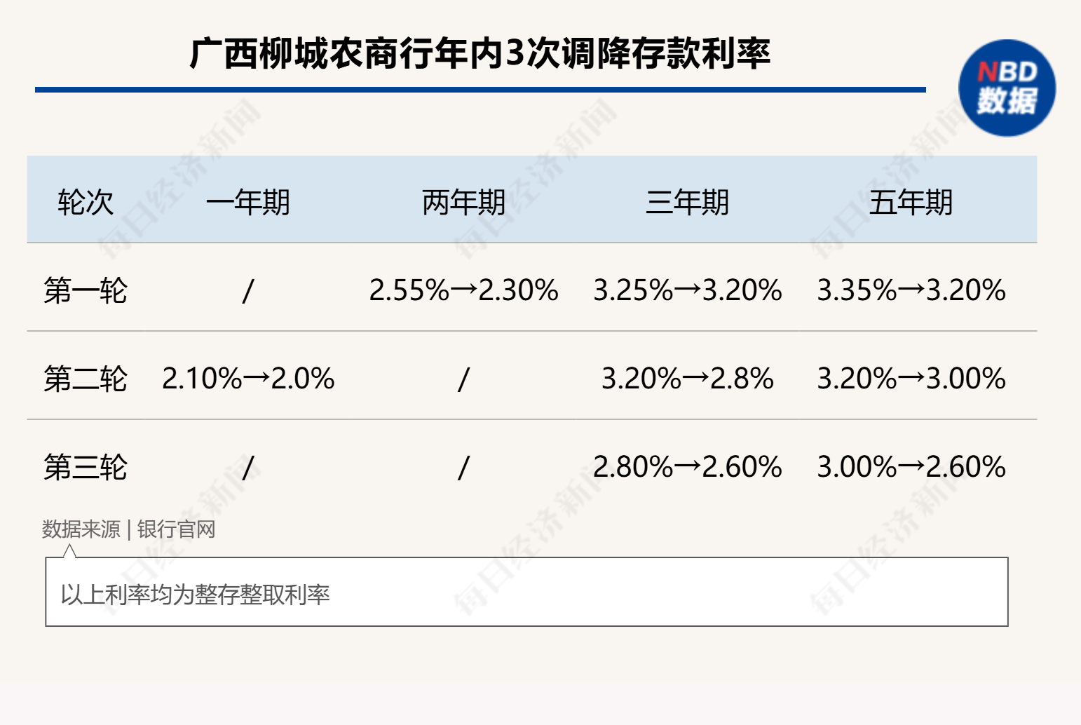 例如,广西柳城农商行的存款挂牌利率年内已进行了三次调整,其中整存整取三年期、五年期年初分别为3.25%、3.35%,目前均降至2.60%。