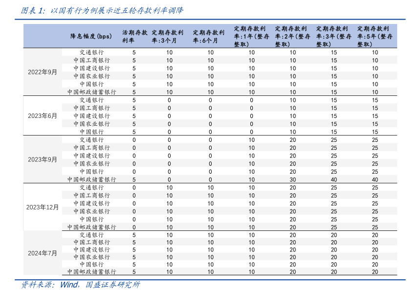 本轮存款降息始于7月25日六大国有行集体宣布调整人民币存款挂牌利率,自2022年4月存款利率市场化调整机制建立以来,以大行为首进行的存款挂牌利率下调已进行了五轮,分别在2022年9月15日、2023年6月8日、2023年9月1日、2023年12月22日、2024年7月25日。从前几轮存款利率下调节奏来看,均是大行领头,股份行、城商行、农商行等陆续跟进。