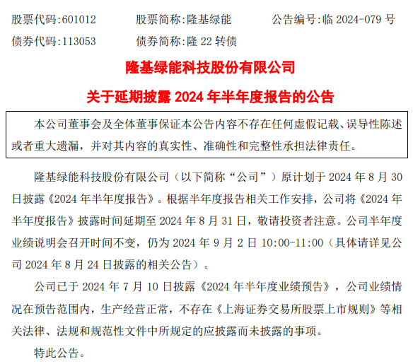 隆基绿能公告,公司原计划于2024年8月30日披露《2024年半年度报告》。根据半年度报告相关工作安排,公司将《2024年半年度报告》披露时间延期至2024年8月31日,敬请投资者注意。公司半年度业绩说明会召开时间不变,仍为2024年9月2日10:0-11:0。公司已于2024年7月10日披露《2024年半年度业绩预告》,业绩情况在预告范围内,生产经营正常,不存在应披露而未披露的事项。