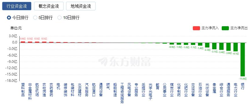 净流出方面,银行、电力行业、通信服务等净流出排名靠前,其中银行净流出15.85亿元。