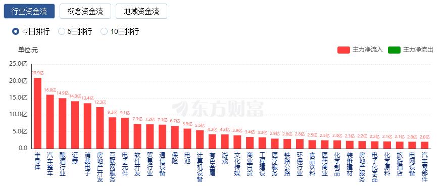 行业资金方面,截至收盘,半导体、汽车整车、酿酒行业等净流入排名靠前,其中半导体净流入20.94亿。