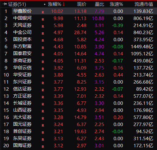 个股方面,华鑫股份、中国银河涨停,天风证券、中金公司、国投资本、东方财富等纷纷大涨。