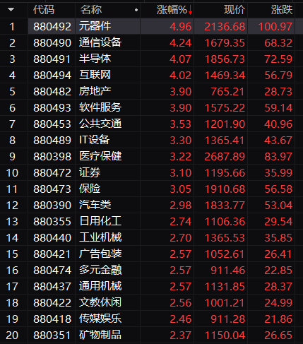行业板块方面,元器件、通信设备、半导体、互联网、房地产、医疗、券商、保险等涨势喜人,仅有银行、电信运营、交通设施绿盘。