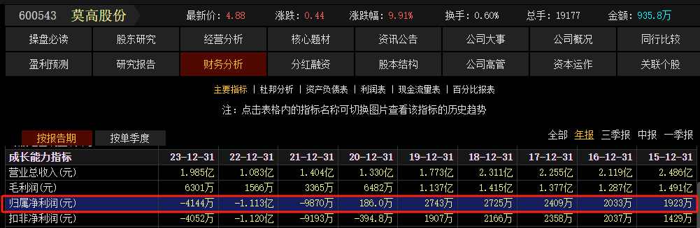 资料显示,莫高股份主业较为分散,涉及葡萄酒、降解材料、医药三个行业。尽管涉猎广泛,但各板块业绩表现并不理想。财务数据显示,莫高股份2021年至2023年分别实现营收1.4亿元、1.08亿元、1.99亿元;实现净利润分别为-9870万元、-1.11亿元、-4144万元。