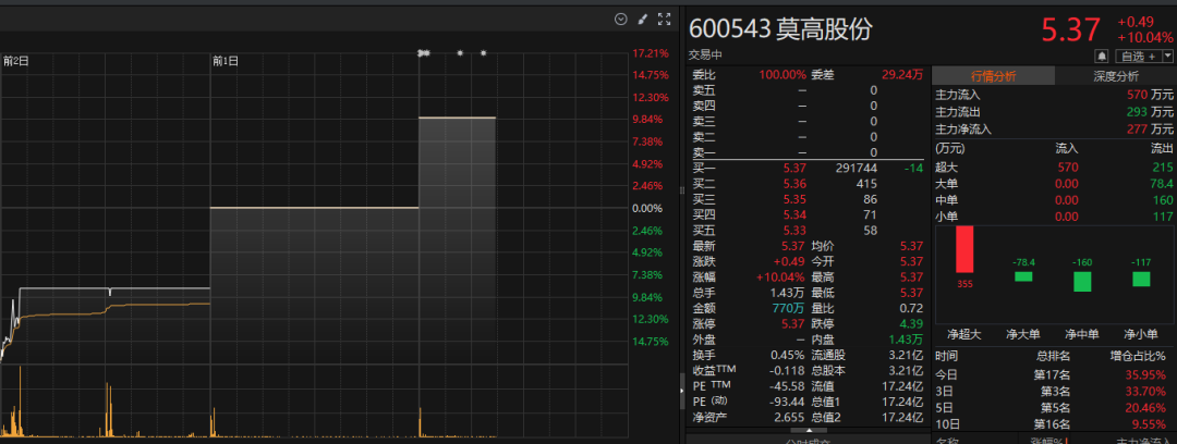 然而,就在披露重组消息前,基本面并无太多利好的莫高股份突然放量涨停。具体来看,公司股票8月28日开盘后迅速拉升涨停,随后涨停板虽短暂打开,但最终仍被大量买单封于涨停。