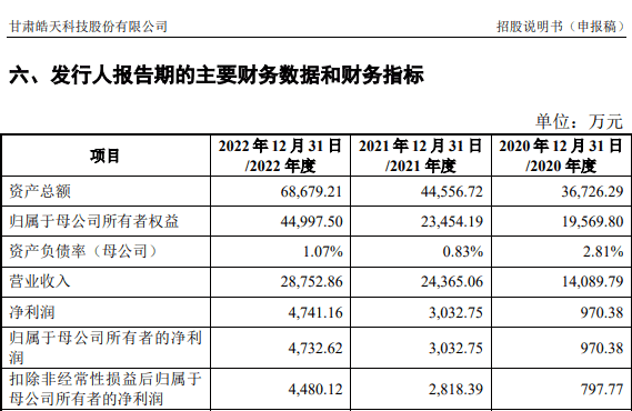 财务方面,据皓天科技此前发布的招股书披露,公司2020年、2021年以及2022年分别实现营业收入1.41亿元、2.44亿元和2.88亿元;净利润分别为970.38万元、3032.75万元和4732.62万元。