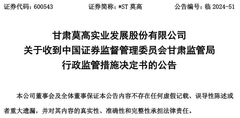 除业绩表现不佳外,莫高股份还因信披数据错误受到监管部门处罚。今年6月下旬,公司收到甘肃证监局下发的行政监管措施决定书。经查,公司信息披露存在问题,包括对客户销售金额、供应商采购金额披露错误等。
