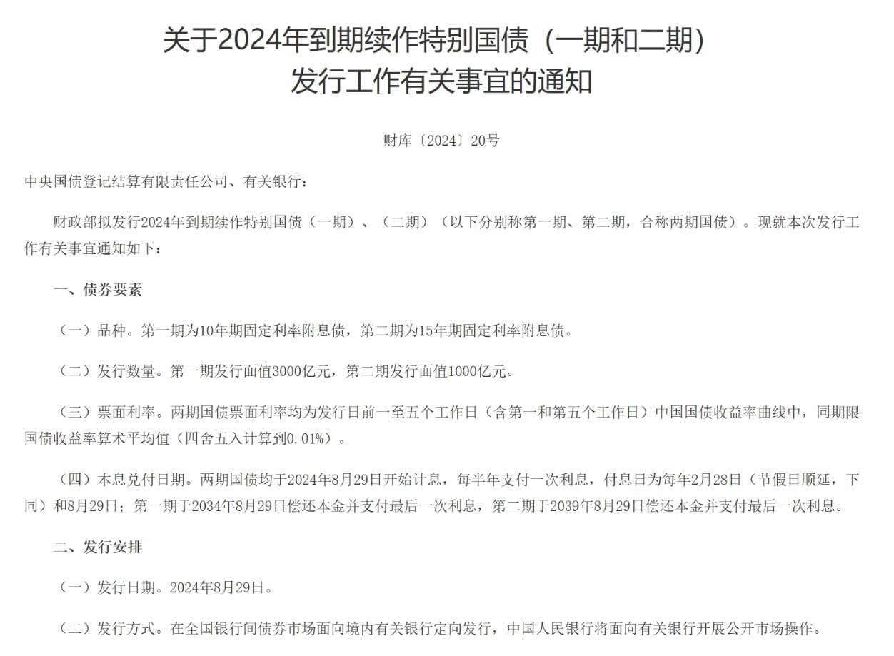 8月19日,财政部发布关于2024年到期续作特别国债发行工作有关事宜的通知。财政部拟发行2024年到期续作特别国债(一期)、(二期)。第一期为10年期固定利率附息债,第二期为15年期固定利率附息债。第一期发行面值3000亿元,第二期发行面值1000亿元。两期国债票面利率均为发行日前一至五个工作日(含第一和第五个工作日)中国国债收益率曲线中,同期限国债收益率算术平均值(四舍五入计算到0.01%)。发行日期为2024年8月29日,在全国银行间债券市场面向境内有关银行定向发行,中国人民银行将面向有关银行开展公开市场操作。