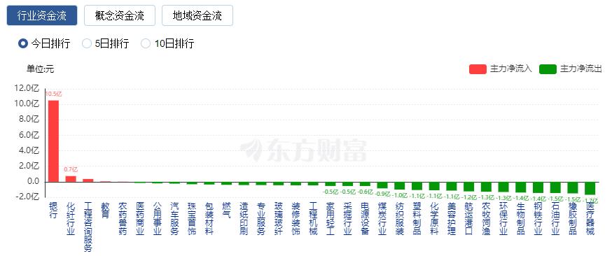 行业资金流向:10.50亿净流入银行