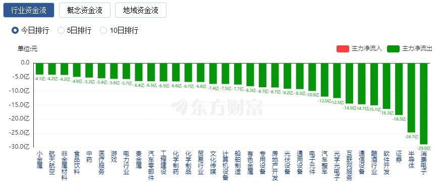 净流出方面,消费电子、半导体、证券等净流出排名靠前,其中消费电子净流出28.99亿元。
