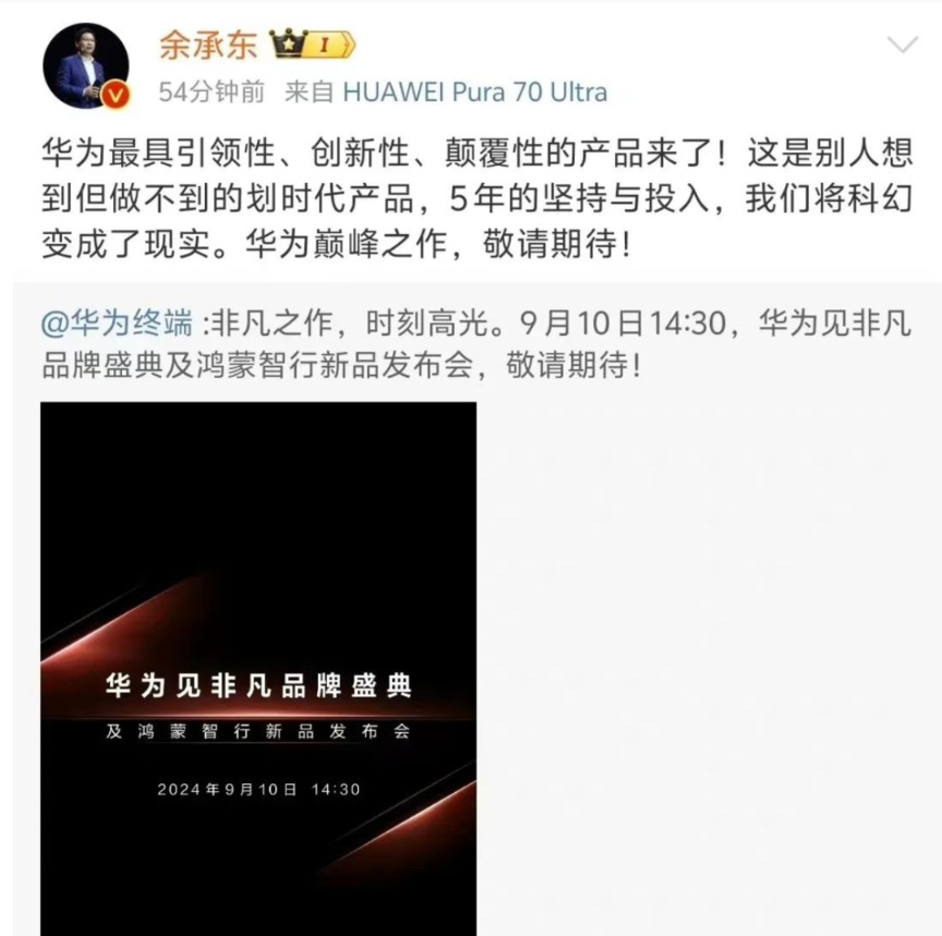 华为官宣后,余承东在微博回应称, 华为最具引领性、创新性、颠覆性的产品来了!
