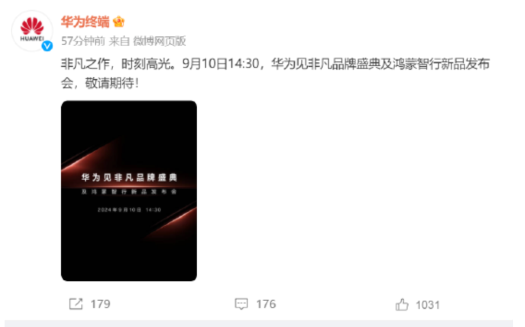 华为终端称,“非凡之作,时刻高光。9月10日14:30,华为见非凡品牌盛典及鸿蒙智行新品发布会,敬请期待!”值得注意的是,苹果此前也刚刚公布了秋季新品发布会的时间:北京时间9月10日凌晨1点,主题是“高光时刻”。