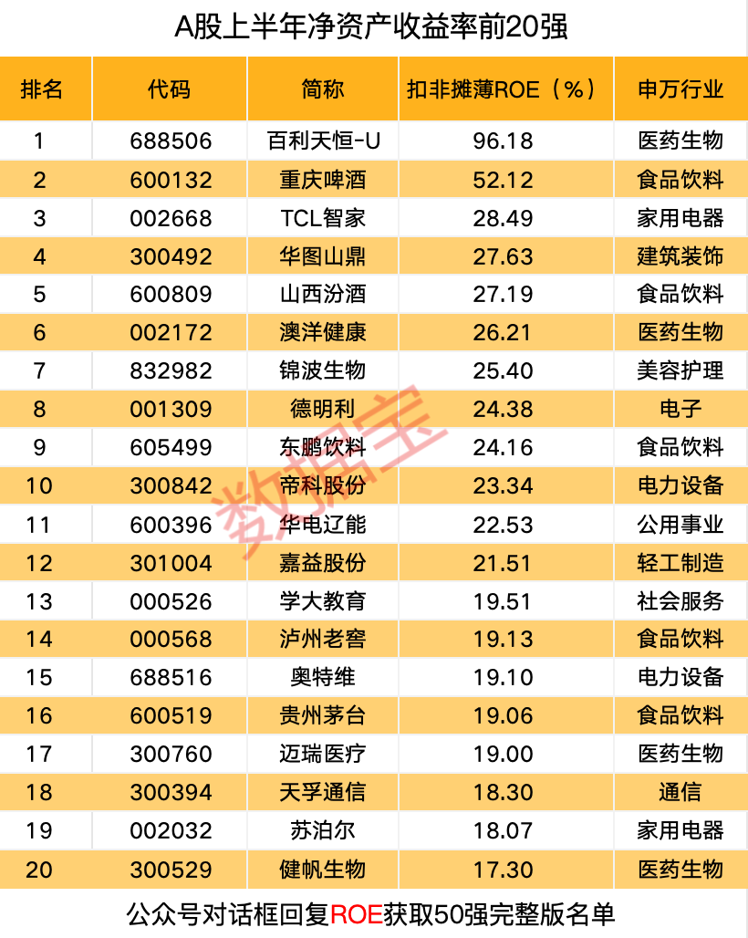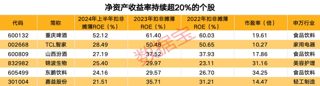 数据宝按照今年上半年、2023年和2022年的扣非摊薄净资产收益率均超20%来筛选,共有6只A股入围。