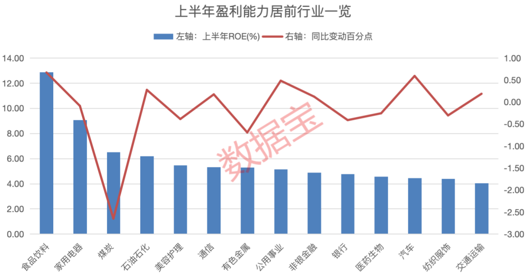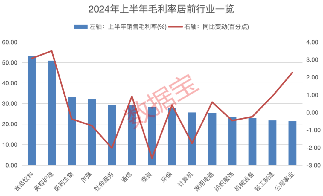 据证券时报·数据宝统计,剔除金融行业(银行及非银行金融),申万一级行业中,常年位居毛利率冠军宝座的食品饮料行业今年上半年依旧稳居第一,毛利率达53.1%;美容护理、医药生物行业毛利率排在第二和第三位。