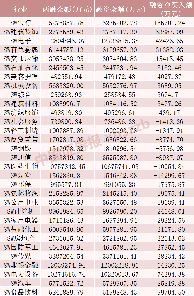 出现融资余额减少的20个行业中,食品饮料、汽车、电力设备行业融资余额减少金额居前,分别为9.97亿元、8.58亿元、7.44亿元。