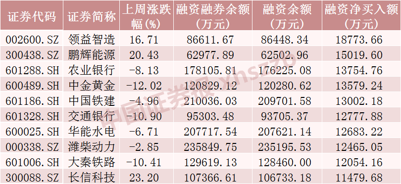 从个股情况来看,上周融资客加仓居前的10只股票分别为领益智造、鹏辉能源、农业银行、中金黄金、中国铁建、交通银行、华能水电、潍柴动力、大秦铁路、长信科技,分别净买入1.88亿元、1.50亿元、1.38亿元、1.36亿元、1.30亿元、1.28亿元、1.27亿元、1.25亿元、1.21亿元、1.15亿元。