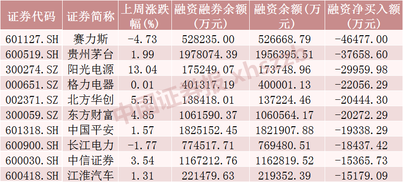 上周融资客减仓居前的10只股票分别为赛力斯、贵州茅台、阳光电源、格力电器、北方华创、东方财富、中国平安、长江电力、中信证券、江淮汽车,分别净卖出4.65亿元、3.77亿元、3亿元、2.21亿元、2.04亿元、2.03亿元、1.93亿元、1.84亿元、1.54亿元、1.52亿元。
