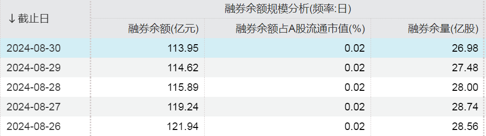 数据显示,截至8月30日,A股市场融券余额为113.95亿元,创逾4年新低;融券余量为26.98亿股,上周融券余额减少8.71亿元。今年以来,A股市场融券余额从715.97亿元下降至113.95亿元,降幅超过80%。