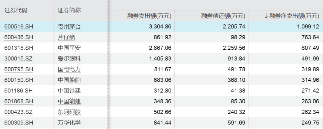 上周融券净卖出额居前的股票为贵州茅台、片仔癀、中国平安,分别为1099.12万元、763.64万元、607.49万元。