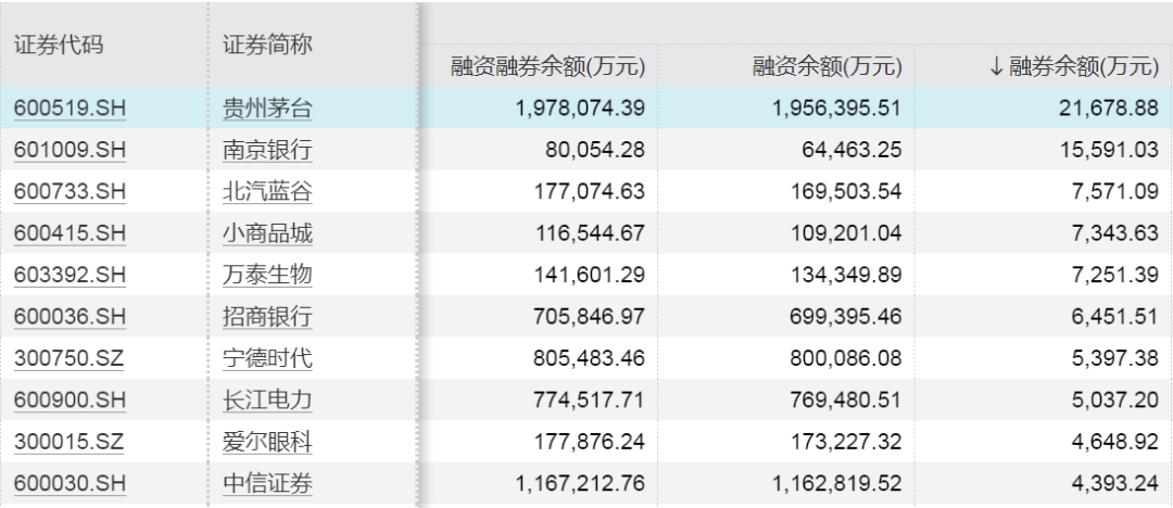 数据显示,截至8月30日,A股市场融券余额居前的股票分别为贵州茅台、南京银行、北汽蓝谷,融券余额分别为2.17亿元、1.56亿元、0.76亿元,仅有两只股票融券余额超1亿元。