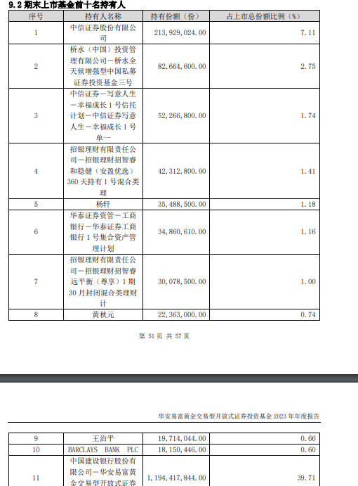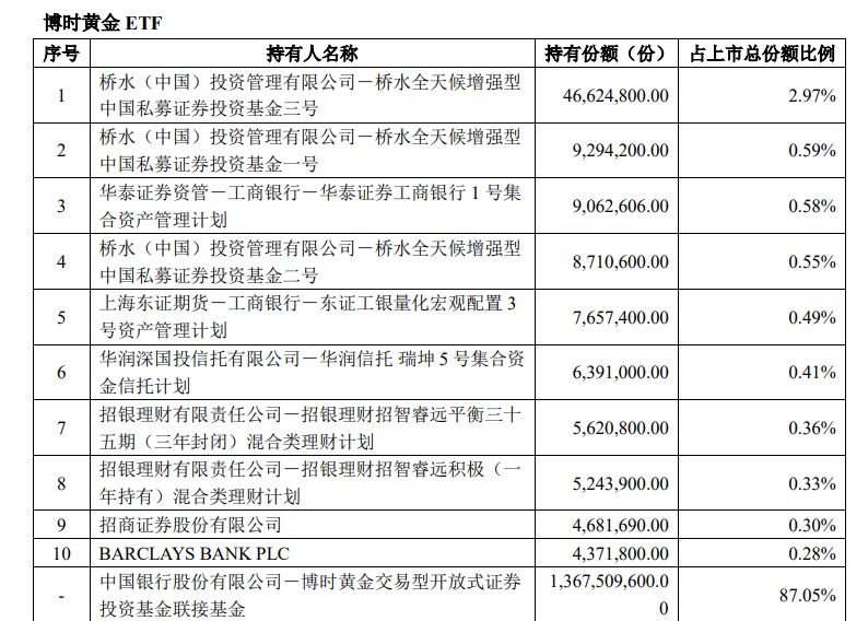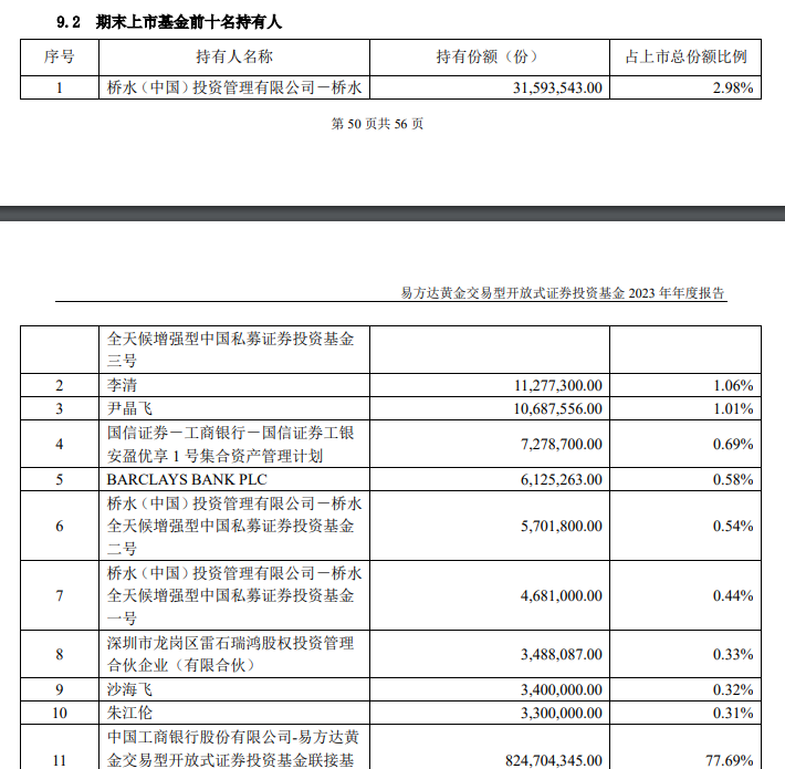易方达黄金ETF2023年年度报告显示,截至2023年末,桥水(中国)投资管理有限公司-桥水全天候增强型中国私募证券投资基金三号位列第一大持有人,持有份额为3159.35万份。