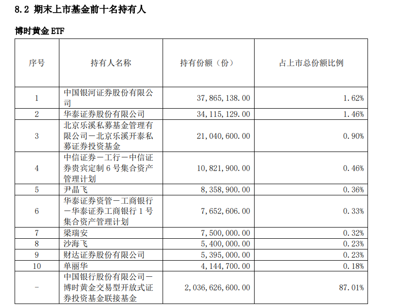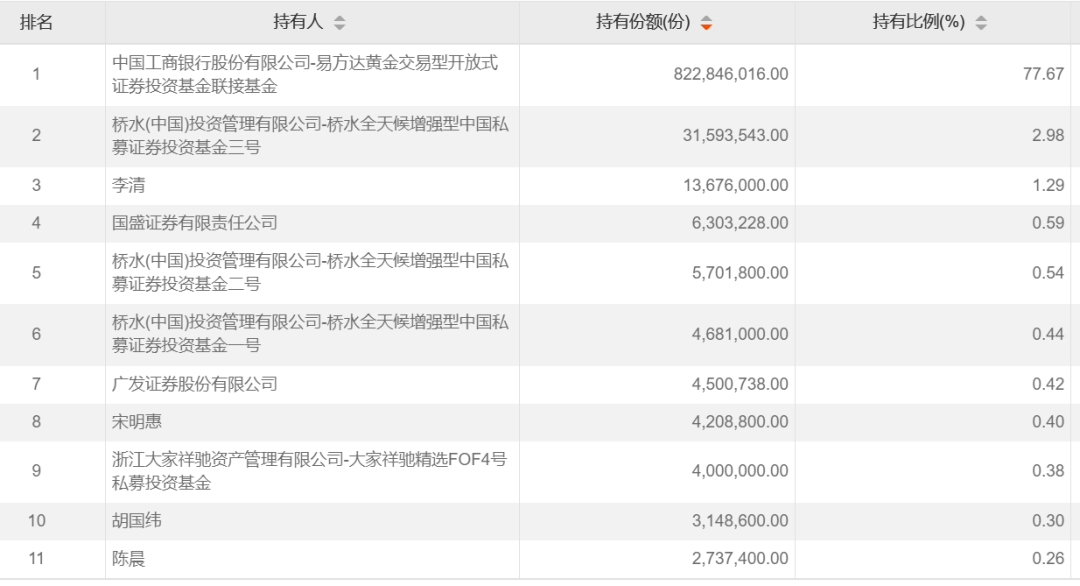 从上图可以看出,截至今年6月底,易方达黄金ETF第十名持有人持有份额为398.76万份。