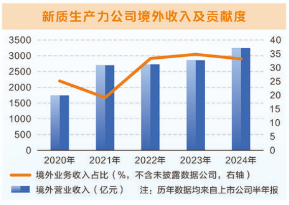 据数据宝统计,新质生产力公司2024年上半年境外收入占营收比例(以下简称“境外收入贡献度”)达33.19%,较2020年上半年提升近8个百分点;近3年上半年境外收入贡献度均超30%,较A股公司整体境外收入贡献度均高出超10个百分点。