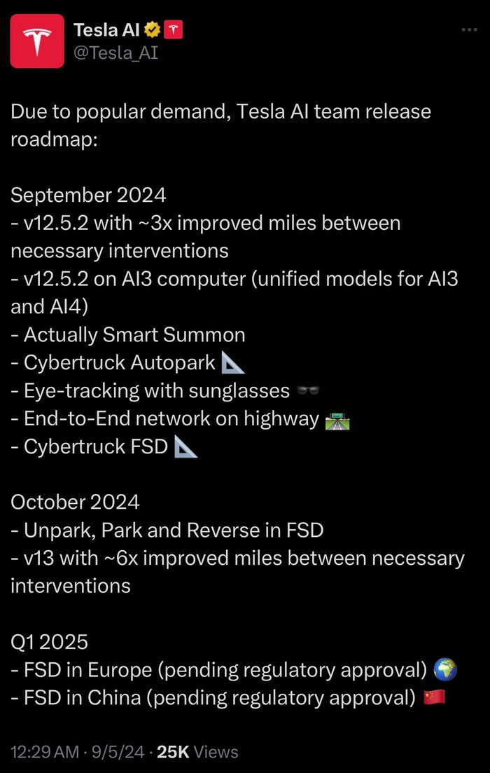 9月5日在X平台上发布路线图,预计2025年第一季度在中国和欧洲推出全自动驾驶(FSD)系统,但仍有待监管批准。