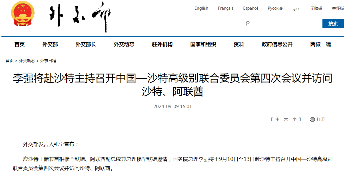 应沙特王储兼首相穆罕默德、阿联酋副总统兼总理穆罕默德邀请,国务院总理李强将于9月10日至13日赴沙特主持召开中国—沙特高级别联合委员会第四次会议并访问沙特、阿联酋。