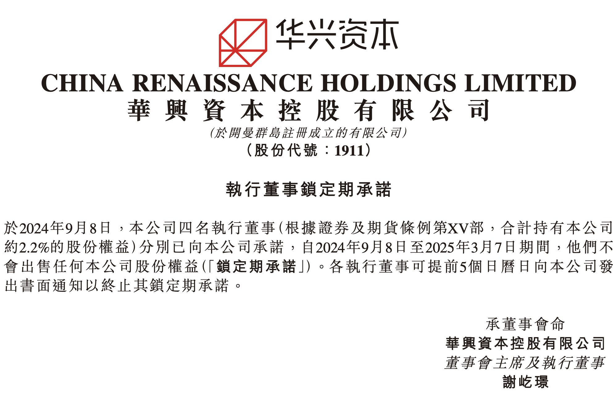 澎湃新闻注意到,9月8日,华兴资本控股发布公告称,董事会主席谢屹璟、副主席林家昌以及两位联席总裁王力行和杜永波在内的四名执行董事分别向华兴资本控股承诺,自2024年9月8日至2025年3月7日期间,他们不会出售任何公司股份权益。