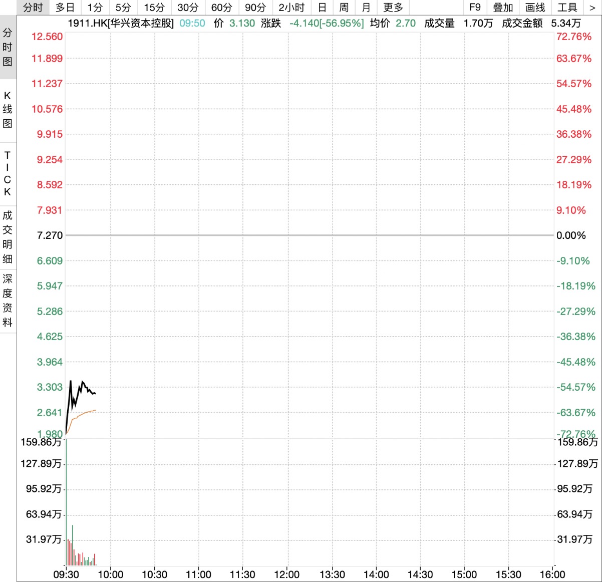 9月9日9时起,华兴资本控股正式恢复买卖。开盘后,华兴资本暴跌近72%。截至发稿前,跌幅收窄至55%。