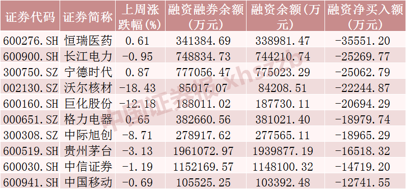 上周融资客减仓居前的10只股票分别为恒瑞医药、长江电力、宁德时代、沃尔核材、巨化股份、格力电器、中际旭创、贵州茅台、中信证券、中国移动,分别净卖出3.56亿元、2.53亿元、2.51亿元、2.22亿元、2.07亿元、1.90亿元、1.90亿元、1.65亿元、1.47亿元、1.27亿元。从市场表现上来看,这10只股票上周跌多涨少,涨幅最大的宁德时代涨近1%,跌幅最大的沃尔核材跌逾18%。