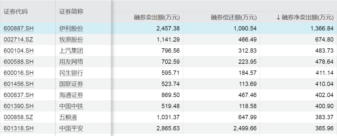 上周融券净卖出额居前的股票为伊利股份、牧原股份、上汽集团,分别为1366.84万元、674.80万元、483.73万元。