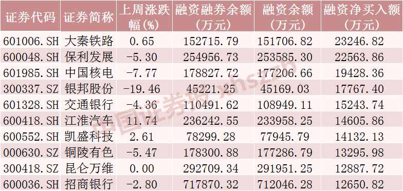 从个股情况来看,上周融资客加仓居前的10只股票分别为大秦铁路、保利发展、中国核电、银邦股份、交通银行、江淮汽车、凯盛科技、铜陵有色、昆仑万维、招商银行,分别净买入2.32亿元、2.26亿元、1.94亿元、1.78亿元、1.52亿元、1.46亿元、1.41亿元、1.33亿元、1.29亿元、1.27亿元。从市场表现上看,上周融资客加仓居前十的股票跌多涨少,涨幅最大的江淮汽车涨逾11%,跌幅最大的银邦股份跌逾19%。