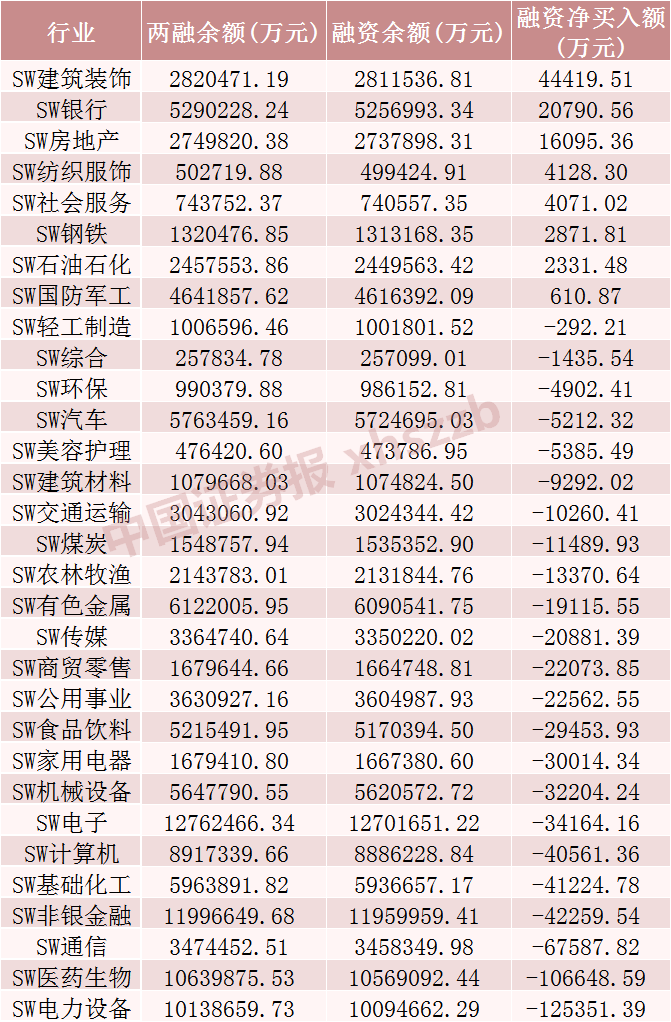 从行业情况来看,上周申万一级31个行业中有8个行业融资余额出现增加,建筑装饰、银行、房地产行业融资余额增加金额居前,分别为4.44亿元、2.08亿元、1.61亿元。