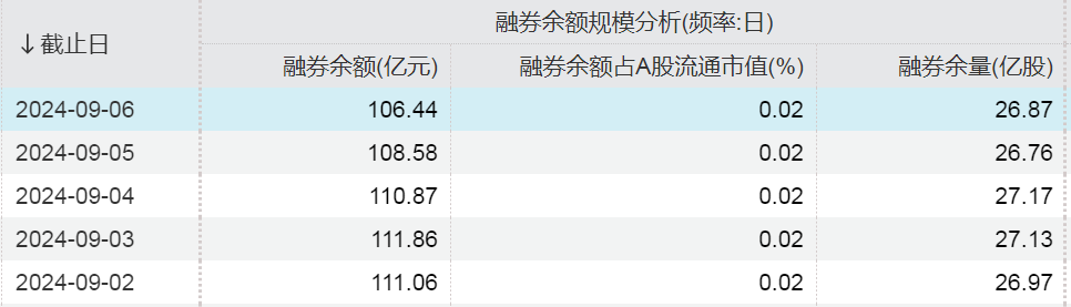Wind数据显示,截至9月6日,A股市场融券余额为106.44亿元,创逾4年新低,上周融券余额减少7.51亿元,融券余量为26.87亿股。今年以来,A股市场融券余额从715.97亿元下降至106.44亿元,降幅超过85%。
