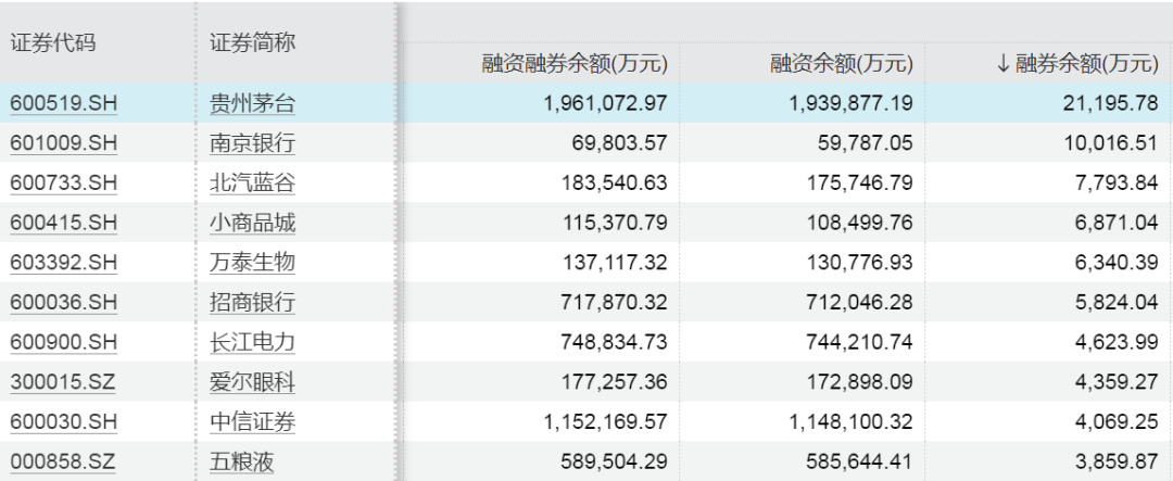 Wind数据显示,截至9月6日,A股市场融券余额居前的股票分别为贵州茅台、南京银行、北汽蓝谷,融券余额分别为2.12亿元、1.00亿元、0.78亿元,仅有2只股票融券余额超1亿元。