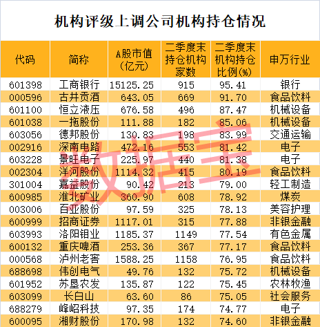 从二季度末的十大流通股东情况来看,机构评级上调公司普遍获机构扎堆重仓。据数据宝统计,截至二季度末,上述74家公司获机构持仓家数均值达到329家,机构持仓比例(占流通股比例)均值为57.44%。