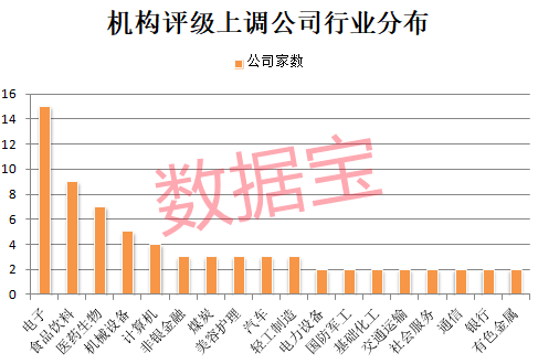 机构上调评级通常表明市场对相关资产或公司的未来发展持乐观态度,认为其具有较好的增长潜力和投资价值。据证券时报·数据宝统计,近一个月来,74家上市公司评级被机构上调。这些公司主要分布于电子、食品饮料、医药生物、机械设备、计算机行业。其中电子行业入围数量最多,有15家。