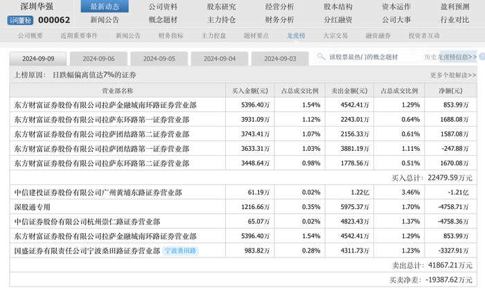 从龙虎榜来看,不少游资也是抢着卖,比如中信建投广州黄埔东路营业部就在9月9日卖了1.22亿元的深圳华强筹码;有的则高抛低吸,控制风险,比如9月9日深圳华强排在前五的买入席位。值得一提的是,买入前五席位均是东方财富证券拉萨游资。深圳华强9月9日买卖前五席位合计净差为-1.94亿元。科森科技9月9日买卖前五席位合计净差为-3103.99万元。大众交通9月9日买卖前五席位合计净差为-2.45亿元。
