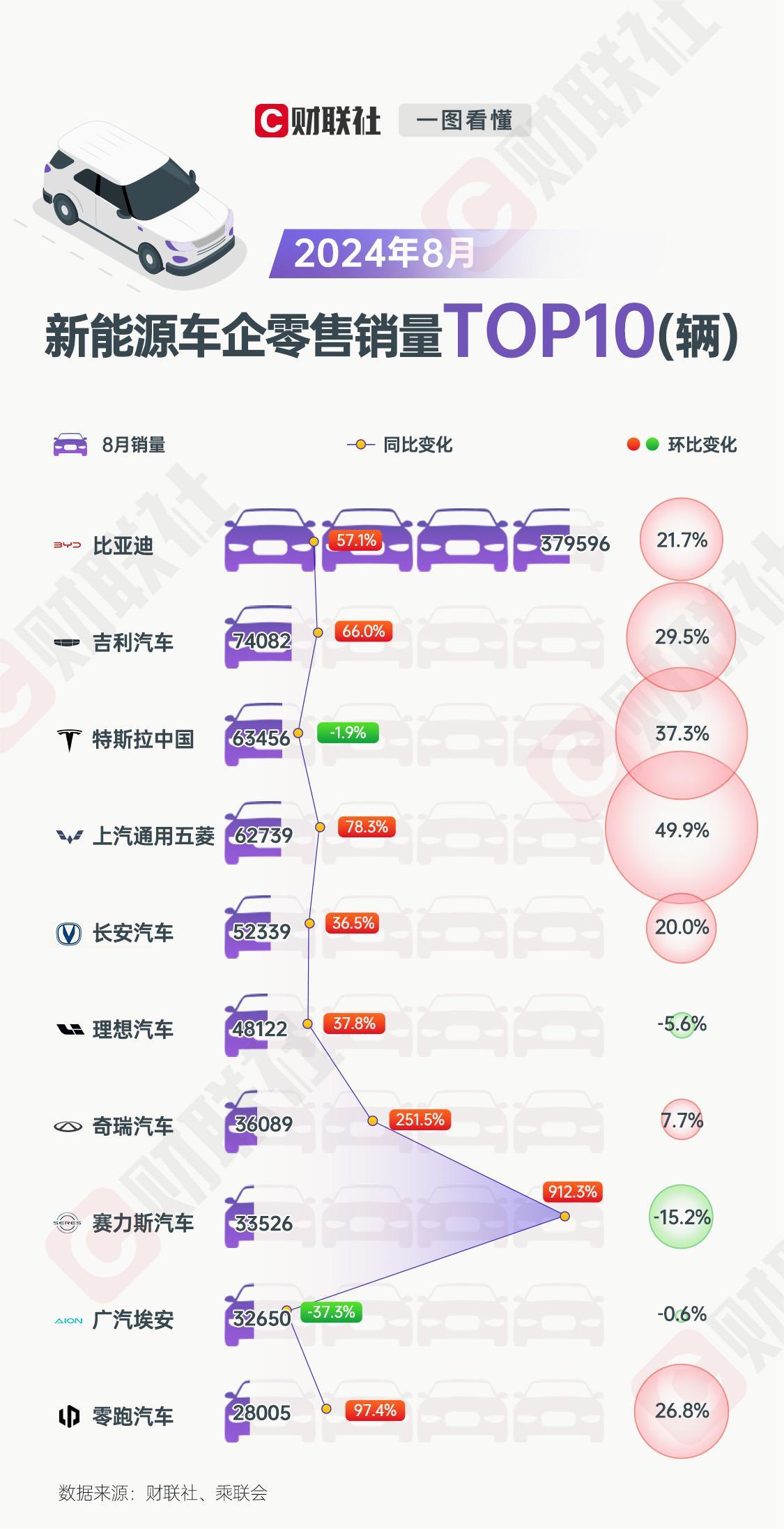 具体品牌方面,8月TOP10榜单名单与7月相比未发生变化,榜单中的部分车企名次出现了调整。