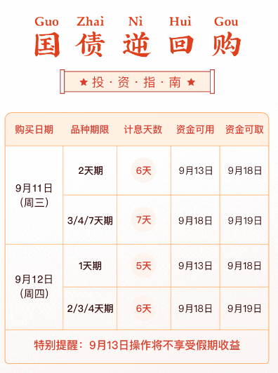 结合今年中秋放假安排,今天(9月12日)就是操作国债逆回购的最佳时点之一。今天,只需投资1天期逆回购就可以赚到5天的利息,而且资金在9月18日开盘前即可到账,也可用于继续投资。