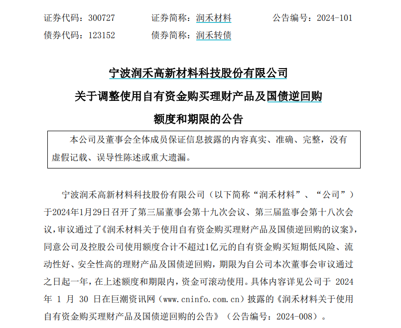 9月4日,上市公司润禾材料发布了《关于调整使用自有资金购买理财产品及国债逆回购额度和期限的公告》。公告称,为更好地提高公司资金使用效率,公司拟将使用自有资金购买短期低风险、流动性好、安全性高的理财产品及国债逆回购的额度由不超过1亿元调整为不超过2亿元,使用期限调整为自本次董事会审议通过之日起12个月。在上述额度和期限内,资金可滚动使用。