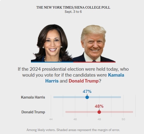 《纽约时报》和锡耶纳学院8日公布的最新民调也显示,特朗普的支持率(48%)仅领先哈里斯(47%)一个百分点,在误差范围内,双方势均力敌。