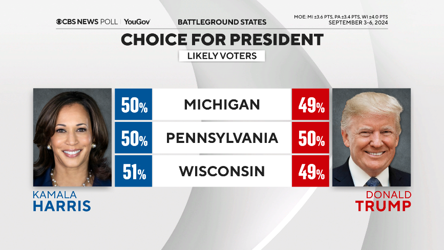本月初,哥伦比亚广播公司(CBS)与民调公司联合进行的最新民调结果显示,在密歇根州、宾夕法尼亚州和威斯康星州这3个关键州,哈里斯和特朗普的支持率分别为50%对49%、50%对50%、51%对49%。
