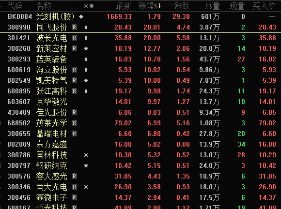 概念板块方面,光刻机指数早盘大涨,同飞股份开盘20cm涨停,张江高科开盘涨停。波长光电、京华激光、凯美特气等概念股涨停。