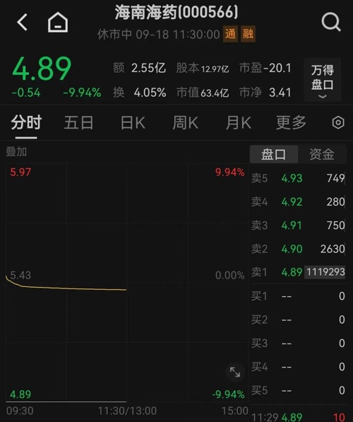 不过,另外一支国企改革概念人气股海南海药就没有那么幸运。曾经6连板的海南海药,今日开盘闪崩跌停后,就一直死死地被摁在跌停板上。